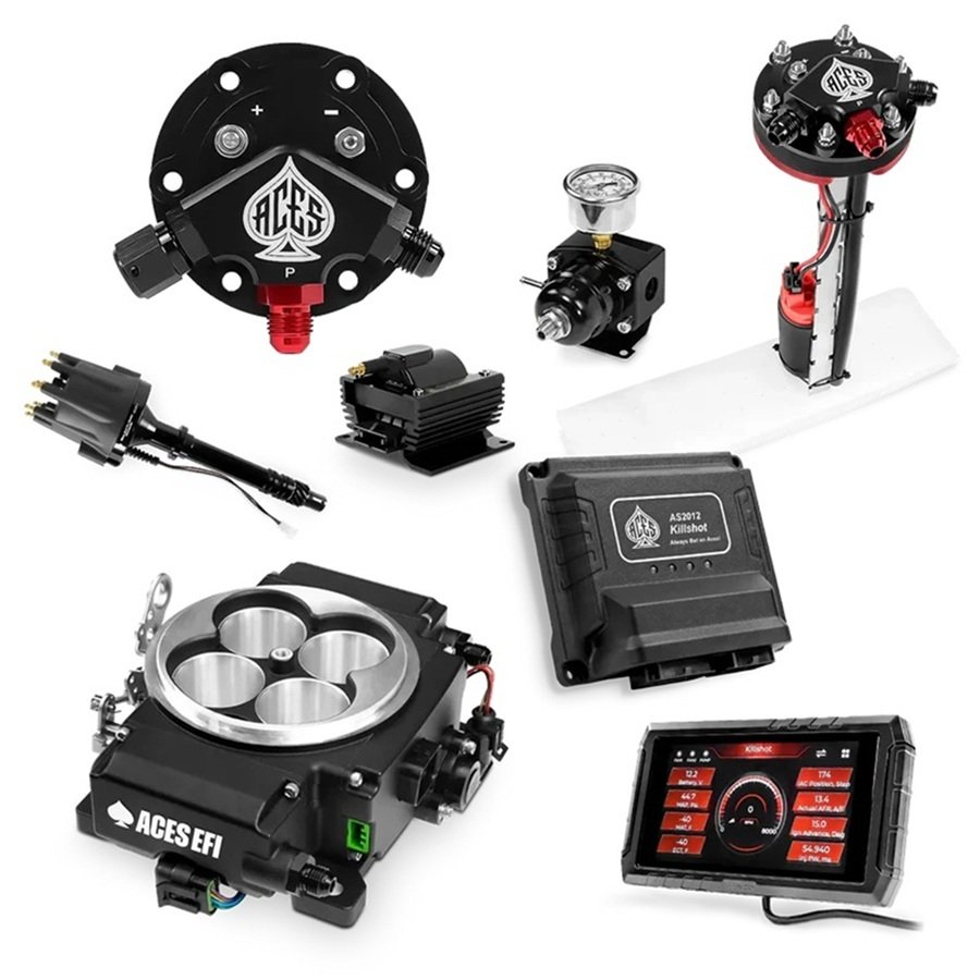 ACES FUEL INJECTION – Killshot II 4-bbl EFI System Master Kit – Fuel Injection – Killshot II 4 bbl EFI – Throttle Body – Square Bore – Computer / Wiring Harness – Aluminum – Black – Kit
