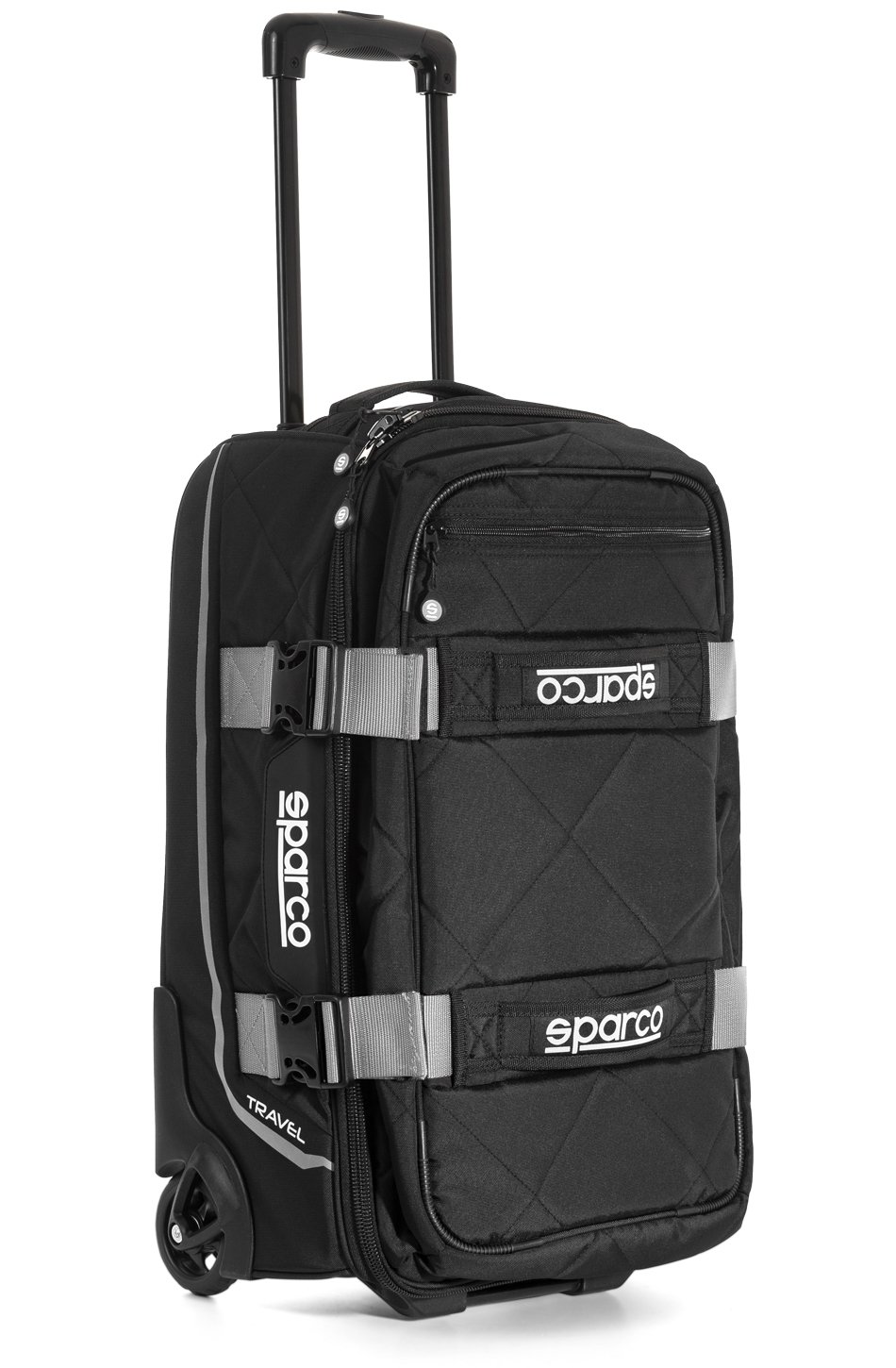 Bag Travel Black / Silver SPARCO Gear Bag – Travel – 22 in Long x 14 in Wide x 10 in Deep – Roller Wheels – Zipper Closure – Retractable Handle – Sparco Logo – Silver Straps – Polyester – Black – Each