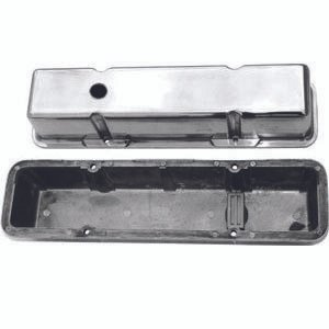 Chrome Alum SBC Valve Covers Plain Pair RACING POWER CO-PACKAGED Valve Cover – Tall – 3.688 in Height – Baffled – Breather Holes – Grommets Included – Aluminum – Chrome – Small Block Chevy – Pair